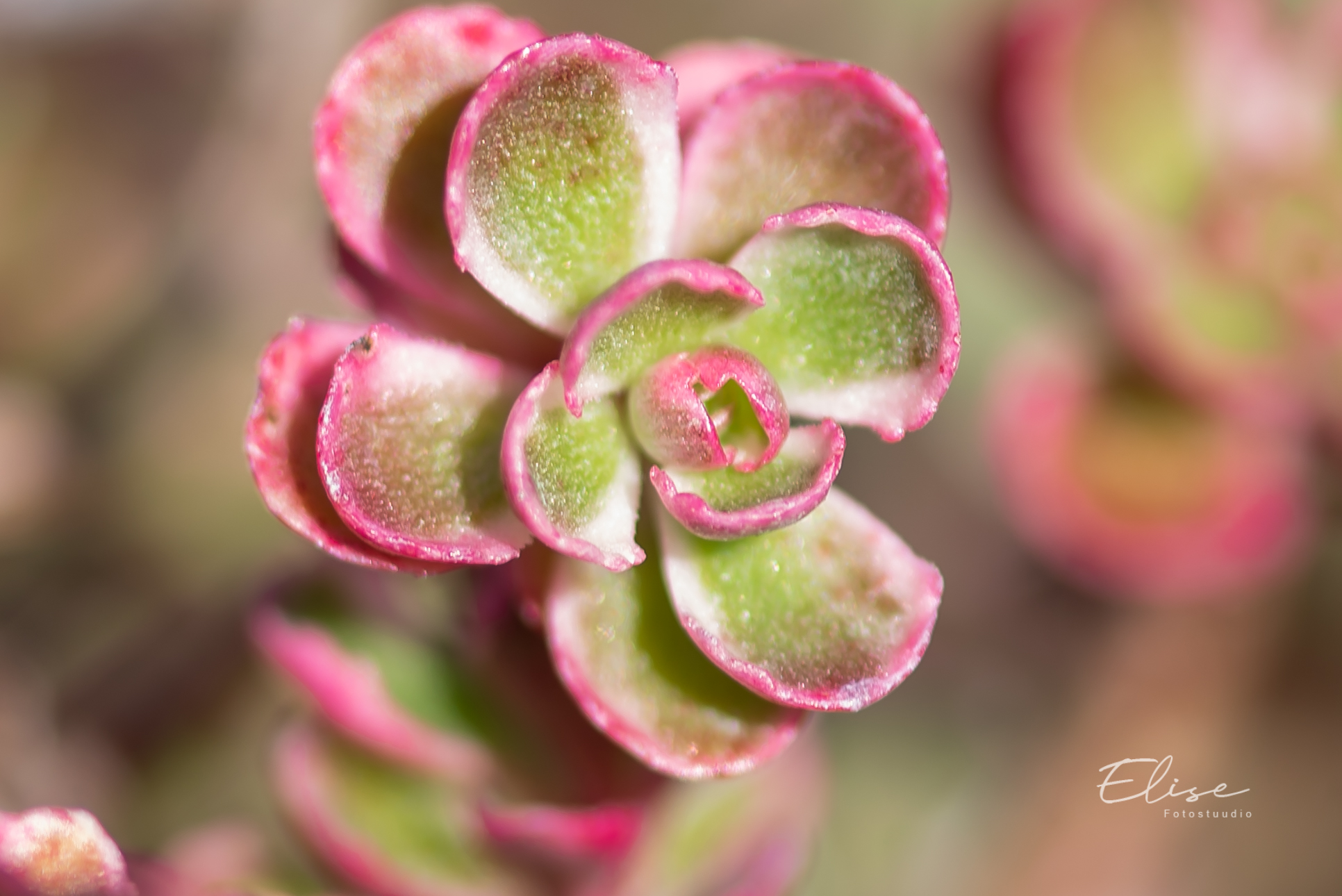 Lehed kirevad, valge-, hallikasrohelise- ja roosakirjud. Taime lehevärv muutub kogu kasvuperioodi jooksul. Õitseb juulis-septembris väikeste kahvaturoosade õitega.