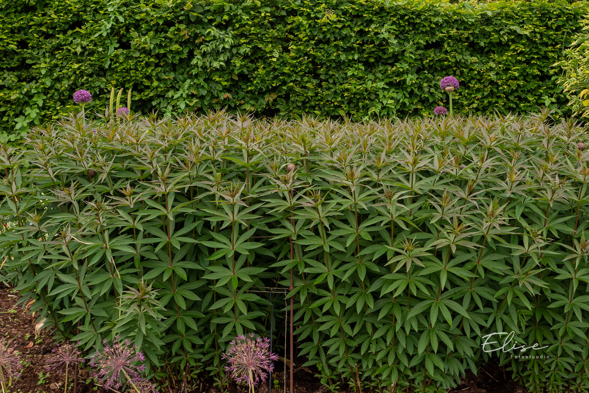 Tumerohelised saagjad lehed on valgetele õisikutele kenaks kontrastiks.