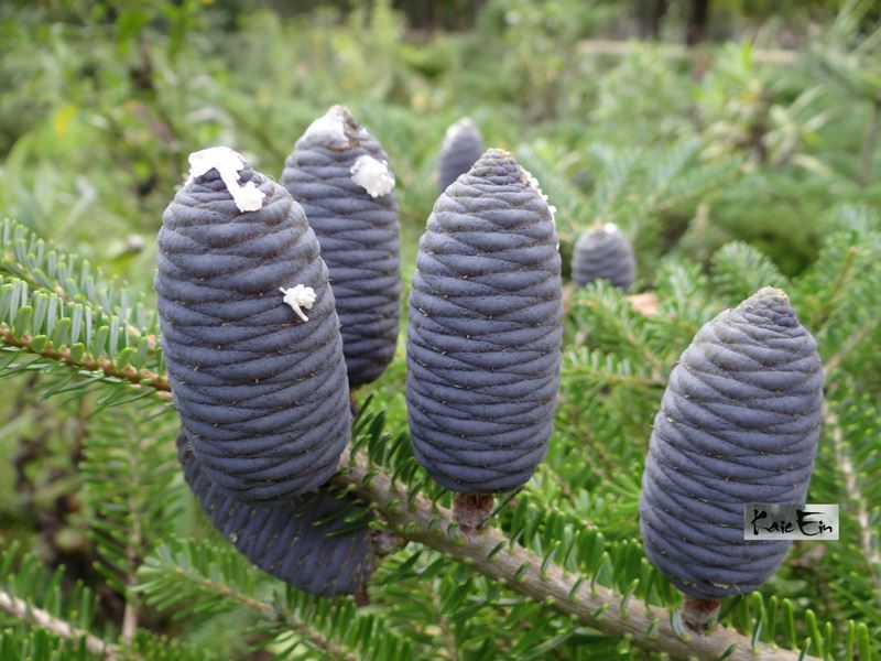 Käbid elliptilised, 4-7 cm pikad, vaigused. Noored käbid hallikas- kuni purpursinised, valminult purpurpruunid. Käbikandvus hakkab juba 10. kasvuaastast alla meetristel taimedel. Rohked püstised käbid teevad puu väga dekoratiivseks.