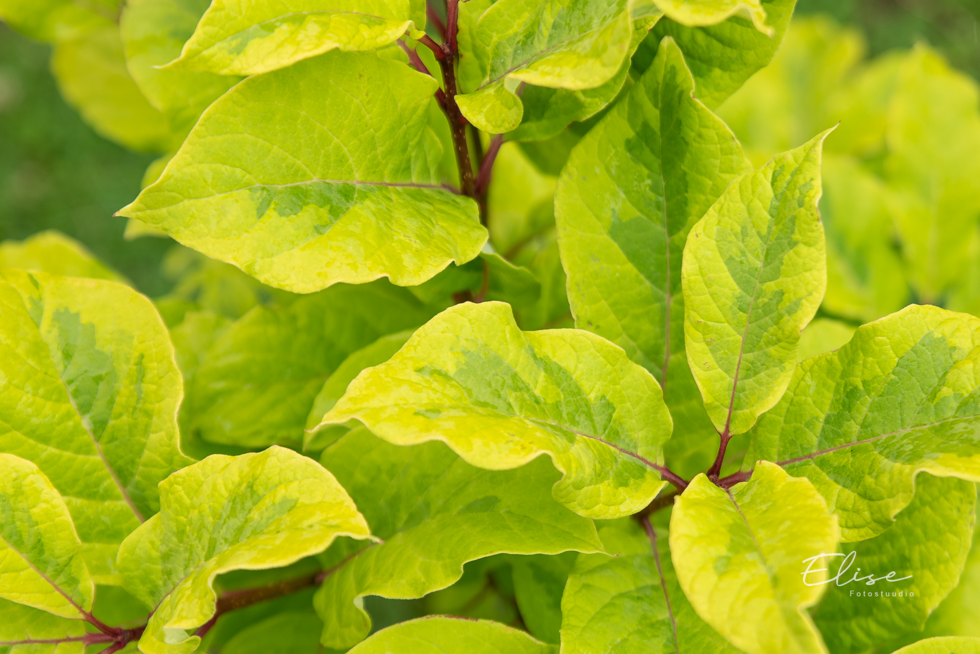 Suured piklikovaalsed lehed on 6-10 cm pikad ja silmatorkavalt mitmevärvilised. Lehed on kollased kuni laimirohelised, keskelt tumerohelise laiguga.